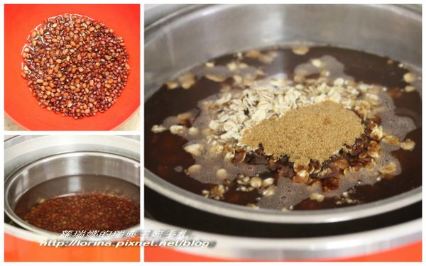 待電源跳起後,加入黑糖、冰糖、燕麥,外鍋再放兩杯水按下電源,跳起即完成 (看你喜歡燕麥的口感是什麼,怕太爛的外鍋就用一杯水即可,但前提是紅豆已經開始開口但還不夠爛的時候,才加糖跟燕麥)